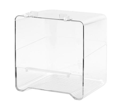 Fabricada en plástico de alta calidad, se coloca fácilmente en el exterior de la jaula mediante ganchos seguros, evitando salpicaduras en el interior.